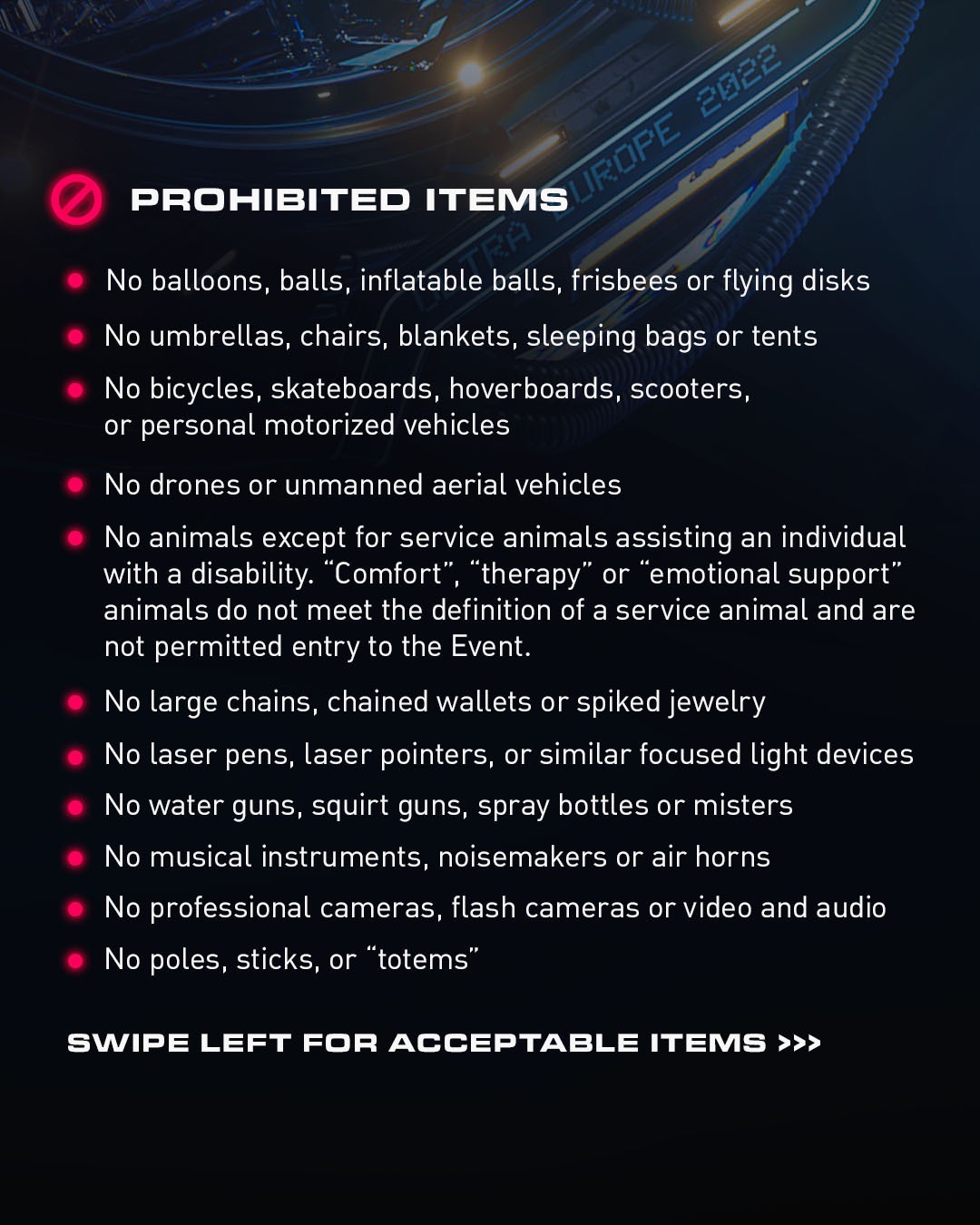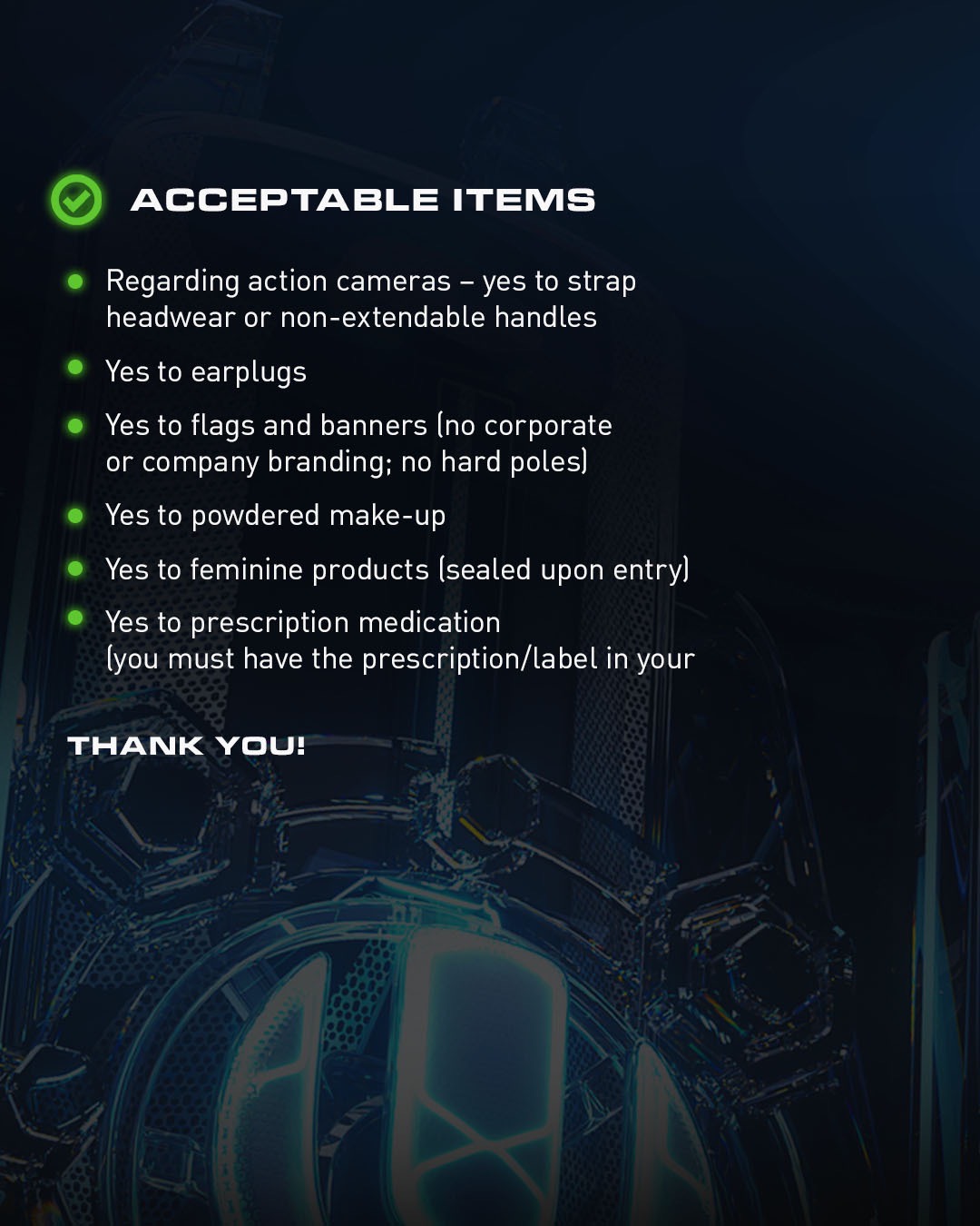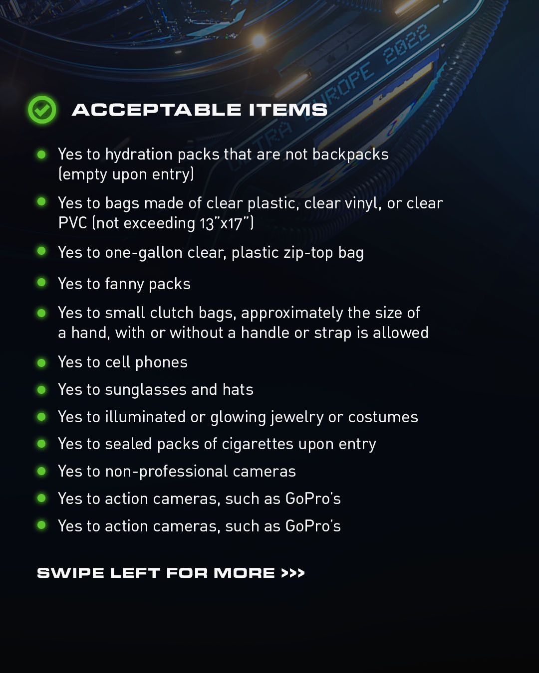 Kako bi ulazak u stadion bio što jednostavniji i brži, a sigurnost svih posjetitelja na najvišoj razini, propisana dozvoljena veličina i tip torbe s kojom je ulaz dozvoljen. Iako organizatori savjetuju da se na festival ne dolazi s torbom, ukoliko je ona neophodna, obavezno mora biti plastična i prozirna te ne veća od 33×43 cm. Male clutch torbe, neseseri te torbice oko struka bit će dozvoljene. Profesionalne foto i video kamere su zabranjene, ali mogu se ponijeti GoPro i ostale action kamere. Bilo koja vrsta zapaljivih sredstava, sprejevi, alkoholna pića i hrana, laseri, veći lanci, pištolji na vodu, maske za lice, kao i bilo koja vrsta ilegalnih supstanci, strogo su zabranjeni na prostoru festivala. Za lakše snalaženje, posjetiteljima je predstavljena i mapa festivala, sa svim najvažnijim informacijama te prodajnim lokacijama.
