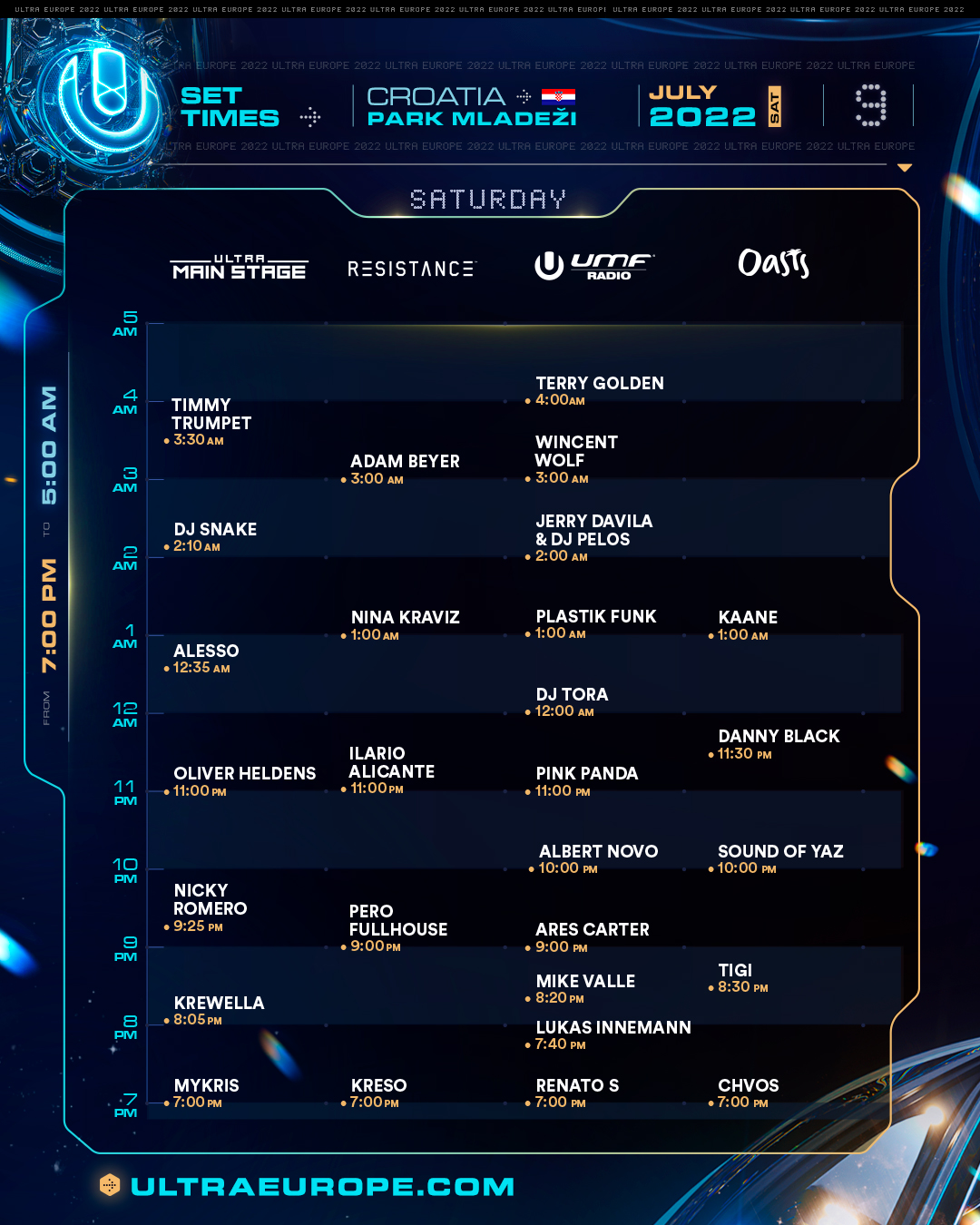 Točna satnica može se pronaći na svim službenim kanalima festivala, internetskoj stranici, društvenim mrežama te službenoj aplikaciji festivala. Petak predvode Afrojack, koji će zasvirati u 00:20 sati, Marshmello, koji na pozornicu izlazi u 1:55 sati te Armin van Buuren, čiji nastup započinje u 3:30 sati. Resistance pozornica ugostit će Richieja Hawtina u 1:00 sati, dok će Amelie Lens izaći u 3:00 sati. Subota izgleda ovako – Alesso stiže u 00:35 sati, DJ Snake u 2:10 sati dok će Timmy Trumpet zasvirati u 3:30 sati te zatvoriti glavnu pozornicu drugi dan festivala. Resistance predstavlja Ninu Kraviz u 1:00 sati, a za kraj stiže, točnije u 3:00 sati, njemačka zvijezda Adam Beyer.