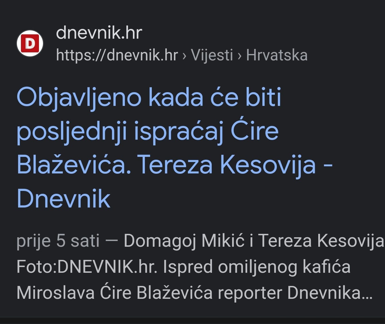Isti je pak potpuno razbijen na Novoj tv. U Dnevniku koji je nokautiran od strane publike, na dan Ćirina odlaska gostovala je Tereza Kesovija. Na pitanje po čemu ćete kao prijateljica pamtiti Ćiru, rekla je – sad sam baš gledala Jarkov intervju…… Dovoljno za paniku i što brži prijelaz na novo pitanje. I dok intervencija u programu uživo nije moguća, na portalu Dnevnik.hr jest. Prvo su objavili gostovanje popularne pjevačice, a onda maknuli jer tu se spominje netko koga žele zaboraviti, a bez istog ne znaju, ne mogu i neće nikada moći.
