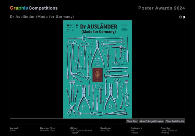 Sa sjedištem u New Yorku, međunarodni izdavač Graphis Inc. svake godine dodjeljuje nagrade za najbolja vizualna ostvarenja Graphis Poster promovirajući važnost plakata kao medija s dubokim utjecajem na kulturu koji “teme, ideje i pokrete objedinjuje unutar jednog okvira”. Nagrade Graphis Poster dodjeljuju se najtalentiranijim dizajnerima plakata, prikazujući radove koji spajaju dojmljiva kreativna rješenja i važne poruke, zadirući u široku paletu tema, od koncerata, plesa, umjetničkih izložbi i kazališnih predstava do ekoloških i društvenih pitanja.