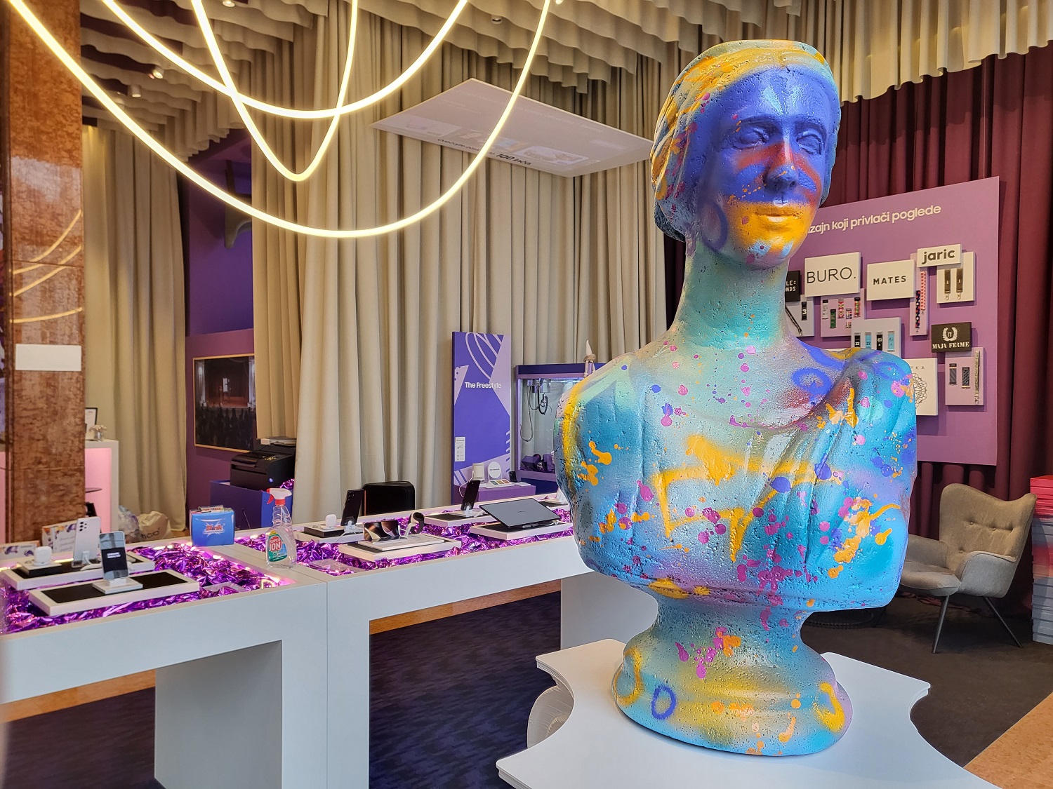 Navedeni izložbeni primjerci prikazivat će se na Galaxy Z Fold4, Z Flip4 pametnim telefonima i The Frame TV-u. Od 02.11. do 16.12. između 10 i 21 sati, zainteresirani posjetitelji imat će priliku razgledati radove, ali i upoznati se i isprobati brojne Samsung pametne uređaje. Uz digitalne primjerke, kolektiv je određene segmente i ručno oslikao, kao što su postamenti, kugla i bista koji su dio interijera prostora.