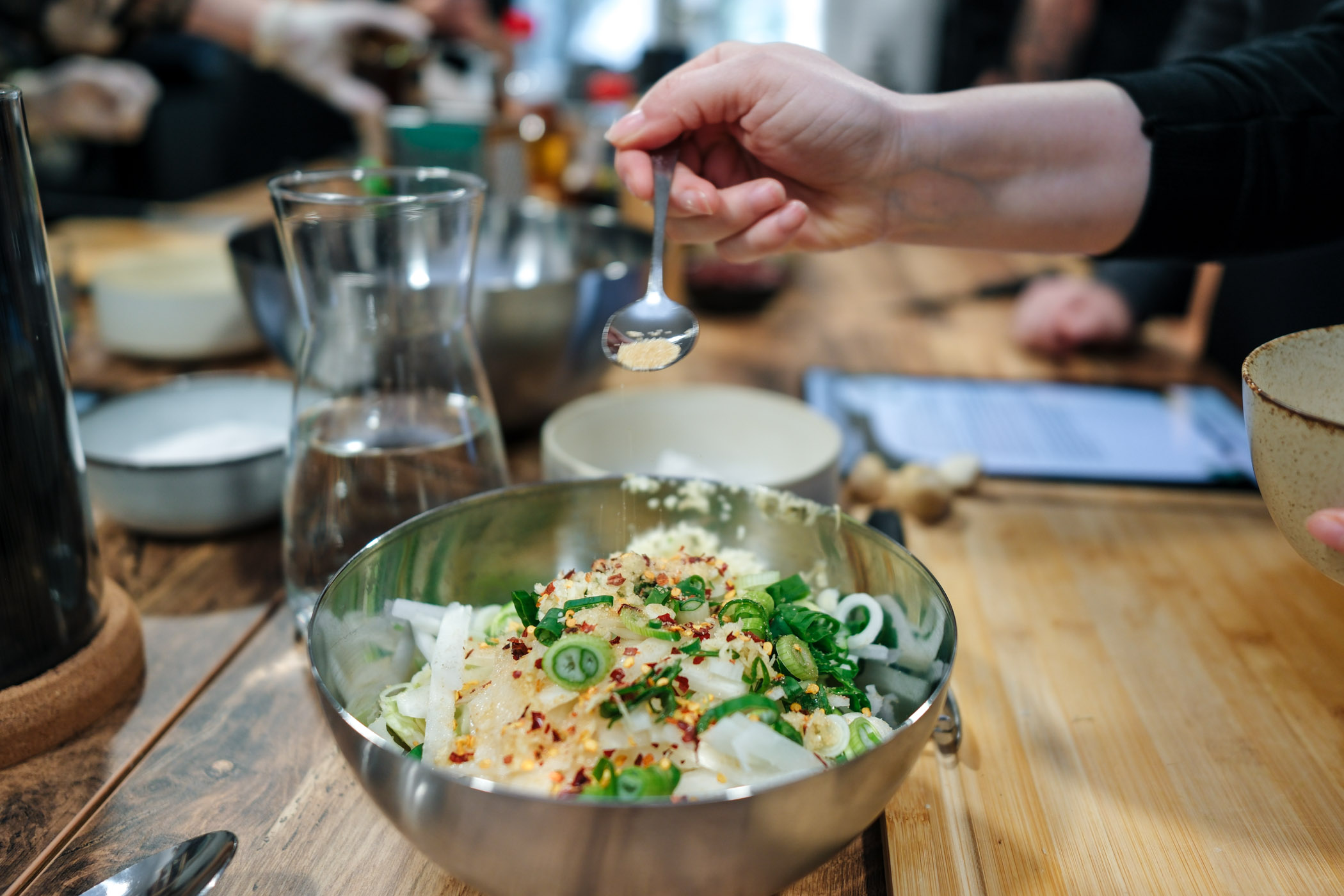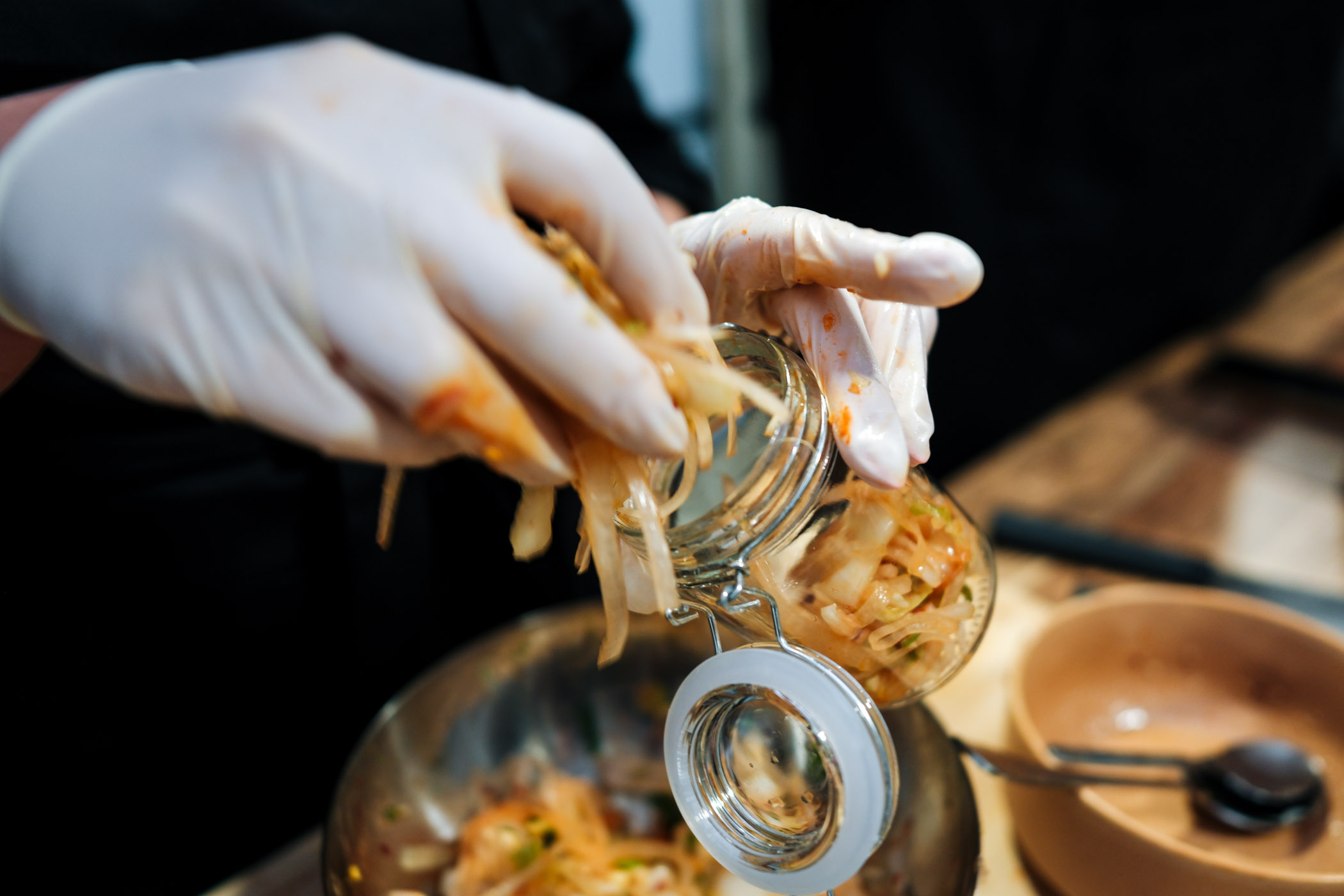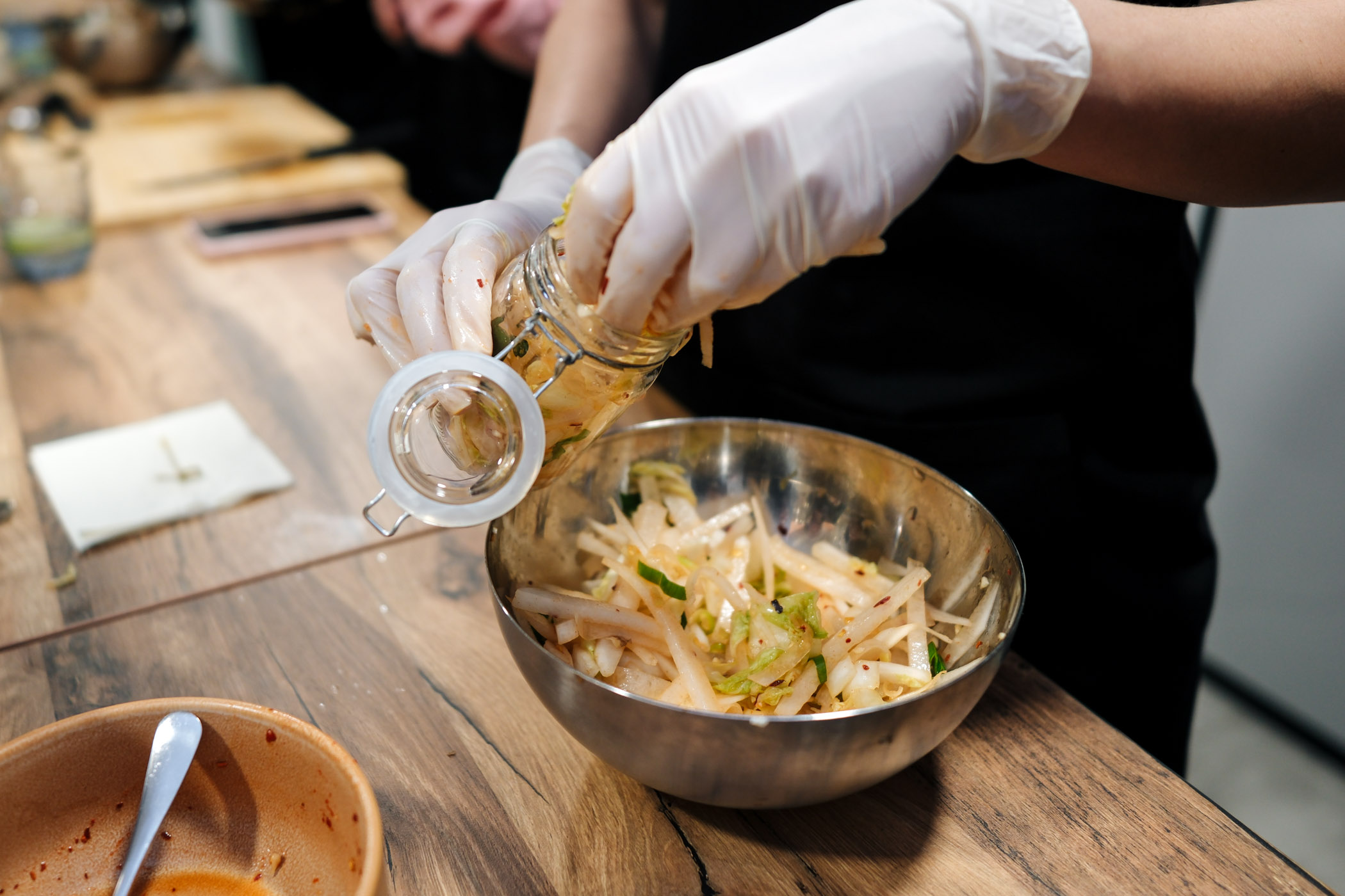 Nakon inicijalne degustacije, kulinarski dio radionice bio je podijeljen u tri dijela, to jest jela – predjelo, glavno jelo i desert. Predjelo Kimchi su sudionici, osim što su kušali, napravili i sami, a ovu specifičnu poslasticu ponijeli su kući na fermentaciju. Kako bi namirnice ostale svježe i ukusne pobrinuo se Samsung Bespoke hladnjak, sa svojim prostranim prostorom za pohranu i Optimal Fresh+ mogućnostima, koje omogućavaju da namirnice ostanu svježe dulje, bez pada kvalitete. Prostrana Space Max unutrašnjost Bespoke hladnjaka pobrinula se da sve namirnice spremno dočekaju kuhanje, a našlo se mjesta i za staklenke Kimchia.