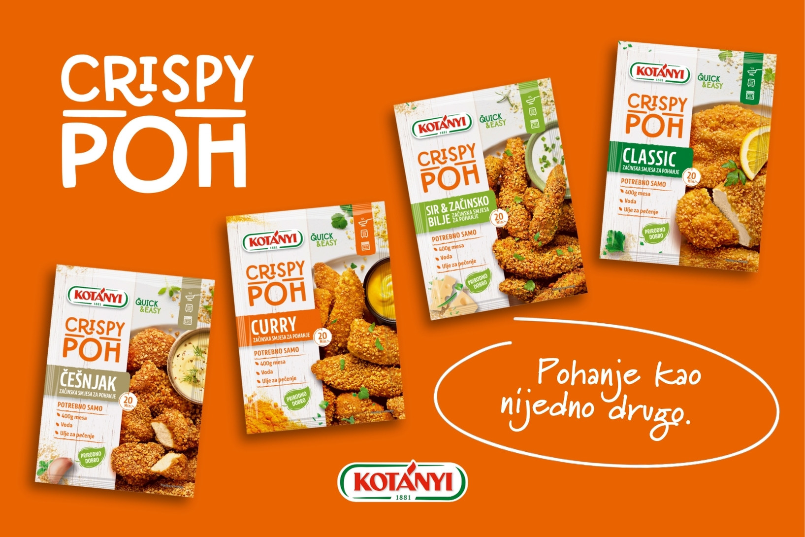 Kotányijevi pomagači za brzu pripremu savršeno hrskavih pohanaca dolaze u četiri različita okusa i garantiraju uspjeh baš svaki put. Crispy POH Classic je, kao što mu i naziv govori, čisti klasik. Hrskava, zlatna korica s blagim, uravnoteženim začinima koji savršeno pašu uz meso ili ribu. Crispy POH Curry ima tople, aromatične note orijentalnih začina uz blagu pikantnost. Intenzivniji okus, hrskavu teksturu i bogatu aromu koja odlično ide uz piletinu, ribu ili povrće pruža Crispy POH Češnjak, a blažu i savršenu kombinaciju sira i aromatičnog mediteranskog začinskog bilja koje se sjajno slažu s piletinom ili ribom daje Crispy POH Sir i začinsko bilje.