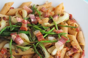 Wok ili dublju tavu zagrijte pa na malo ulja stavite pirjati pancetu, narezani mladi luk, 1 žlicu pasate i bijelo vino. Pirjajte miješajući pet-šest minuta pa dodajte malo tople vode i šparoge te nastavite pirjati četiri-pet minuta. U međuvremenu u loncu za tjesteninu skuhajte penete u slanoj vodi, ocijedite ih i dodajte u umak. Pojačajte potom vatru i pirjajte dok tekućina nije ishlapila miješajući da se sve prožme, dodajte preostalo ulje te po volji posolite i poparite.