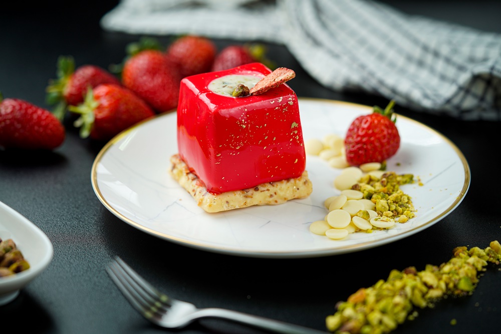 Zaigrani slastičari kombinacijom sezonskih namirnica kroz svaki kolač jedinstvenim okusom predstavljaju po jedno godišnje doba. Slatka i šarolika umjetnička djela sastoje se od jedinstvenog temelja kojeg čini meki keks preliven ukusnom bijelom čokoladom i obasipan sjeckanim najtraženijim orašastim plodom, bademom. Jagoda kao predstavnica veselog proljeća u kojem se sve rađa ispočetka, kao glavnu ulogu ima prozračni mousse te insert od džema od jagoda, a ta savršena crvena kocka začinjena je bijelom čokoladom i sjeckanim pistacijama na vrhu.