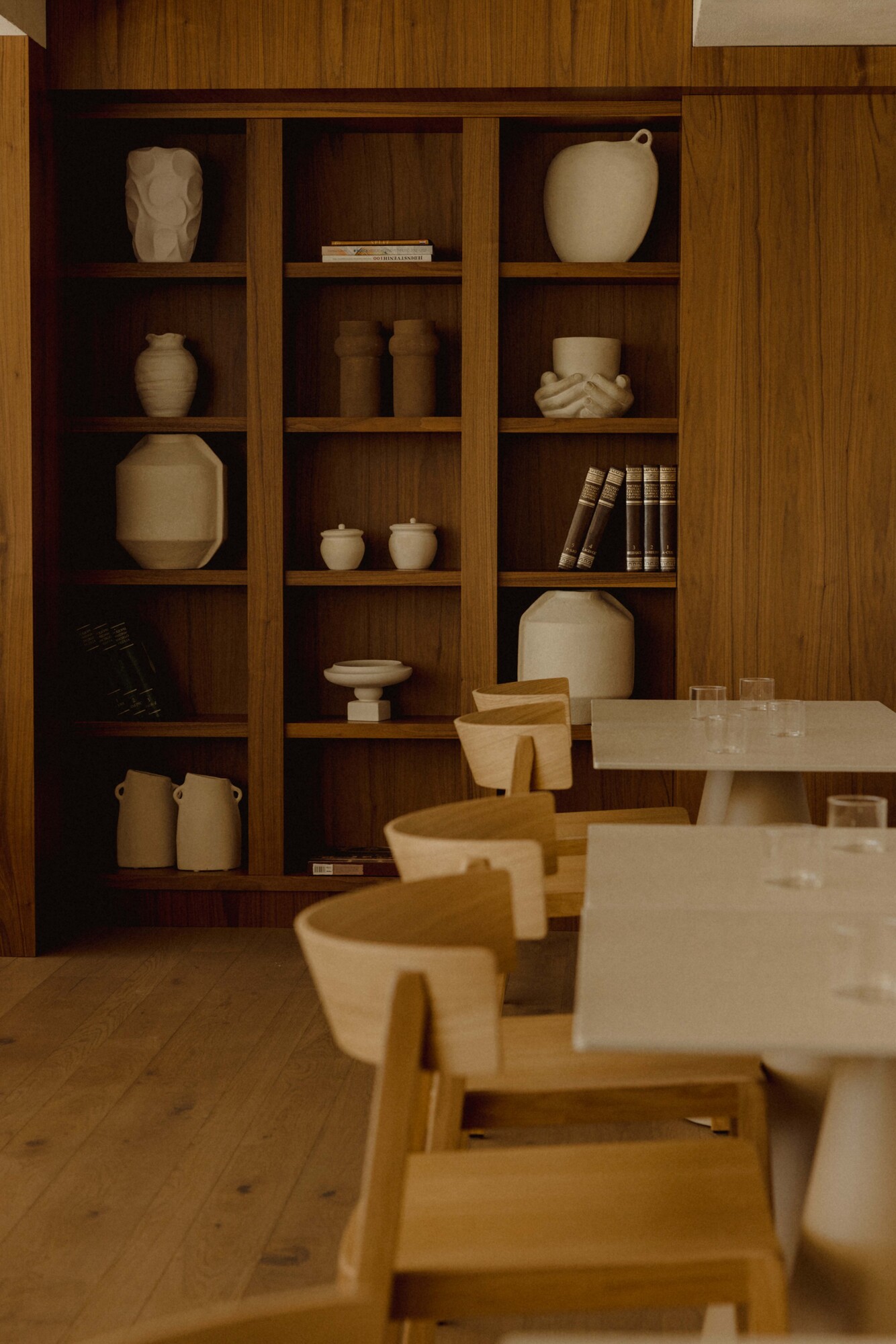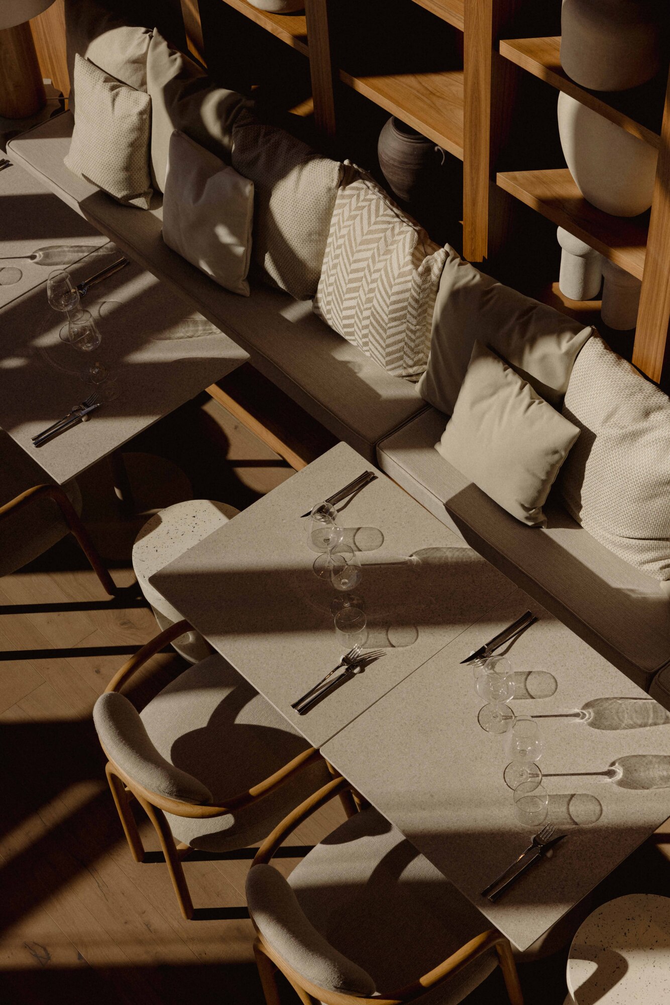 Prostor Allore oblikovao je renomirani arhitektonski studio Zarez, s idejom da restoran bude jednako estetski kao i gastronomski doživljaj. Minimalizam prožet toplinom – kombinacija prirodnih materijala poput drva i kamena, neutralna paleta boja i prozračnost staklenih stijena – sve to stvara osjećaj elegancije i ugode. Biblioteka s dekorativnim vazama daje prostoru ritam i umjetnički karakter, dok lounge zona i udobne stolice naglašavaju društvenu dimenziju restorana.