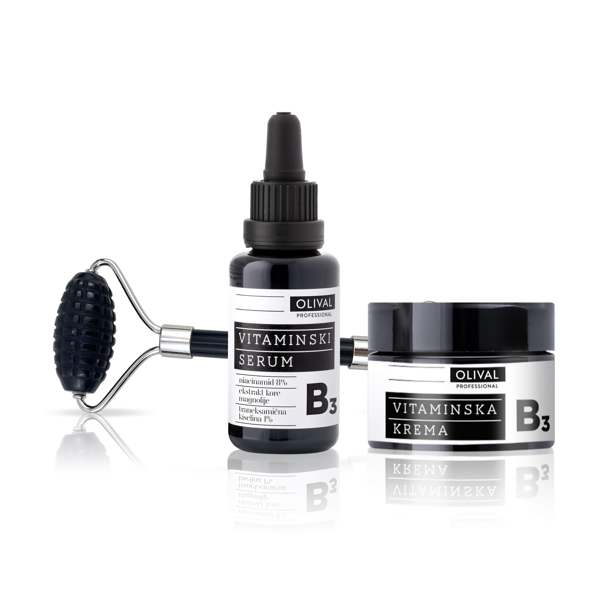 Professional set B3 sadrži Vitaminski serum B3 te Vitaminsku kremu B3 uz masažer za lice od crnog opsidijana, a vole ga i koriste kože sklone nepravilnostima i crvenilu.