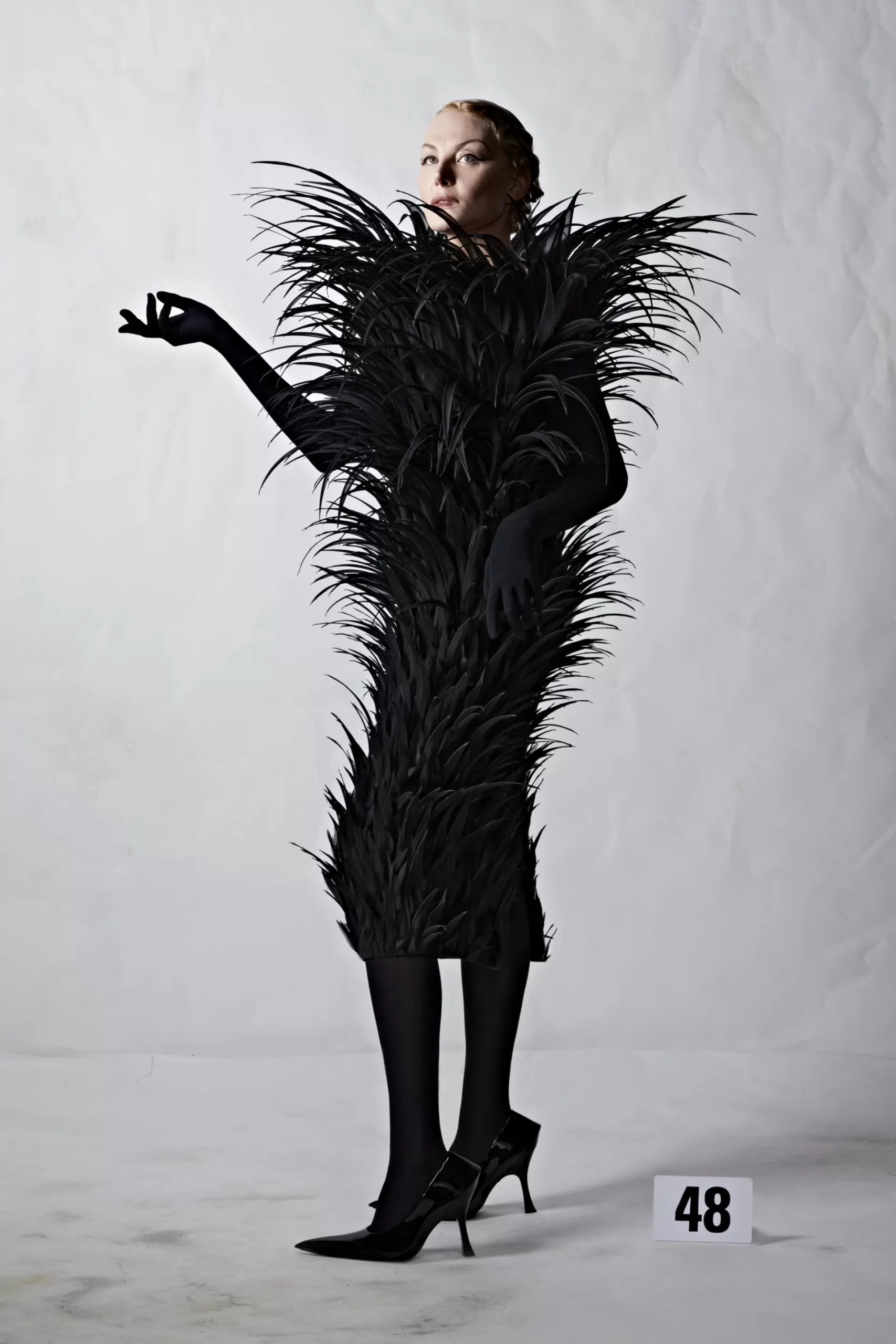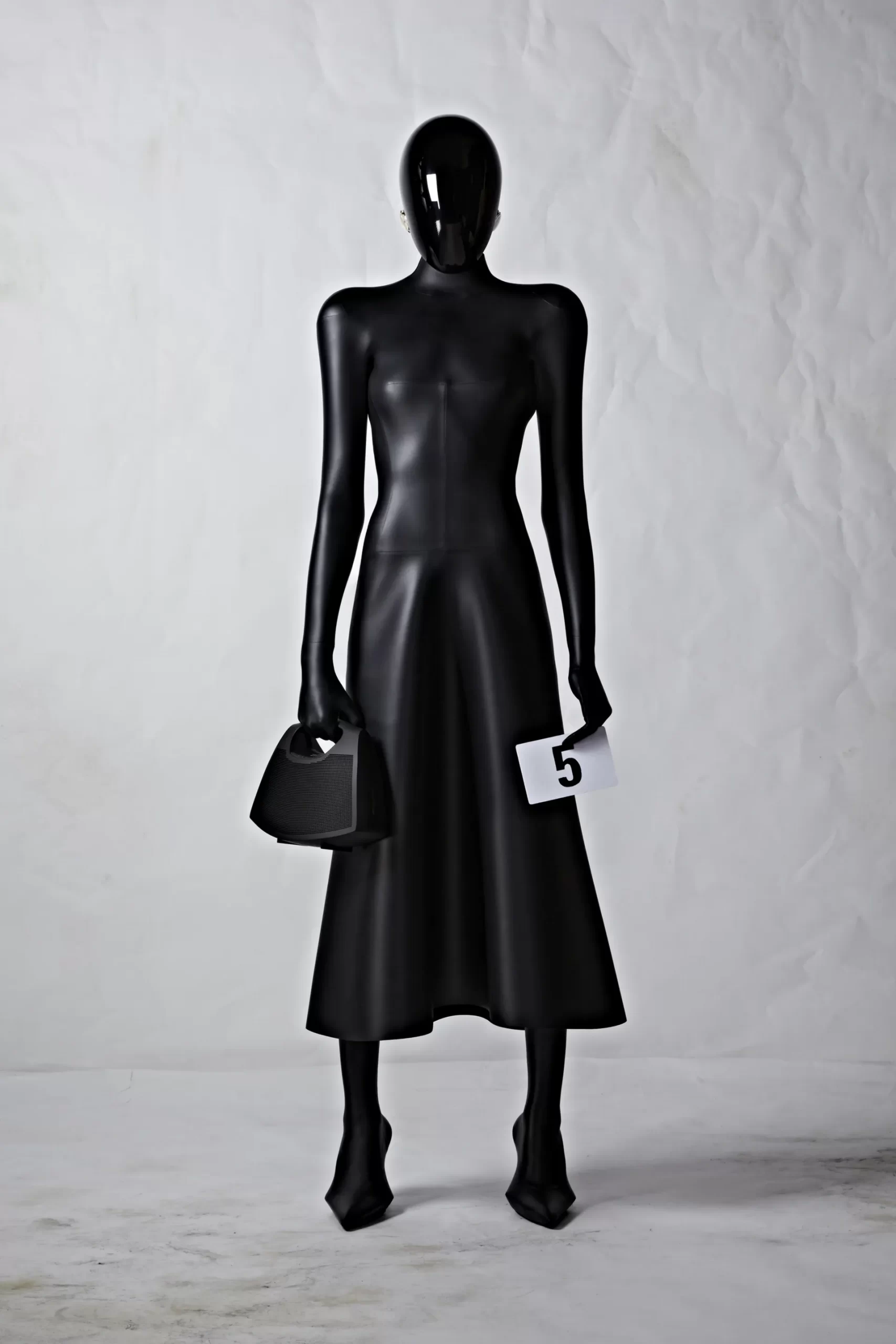 Prvih nekoliko modela izašlo je u raznim oblicima crne kože: bodi, komplet hlača i košulje, haljina s naglašenim ramenima, smoking i haljina s dugim šlepom. Ista tkanina; pet različitih izgleda. Ovo je pametan potez jer u posljednje vrijeme svi želimo posjedovati što više konvertibilnih komada koji nam omogućuju da bez napora prelazimo iz dana u noć.