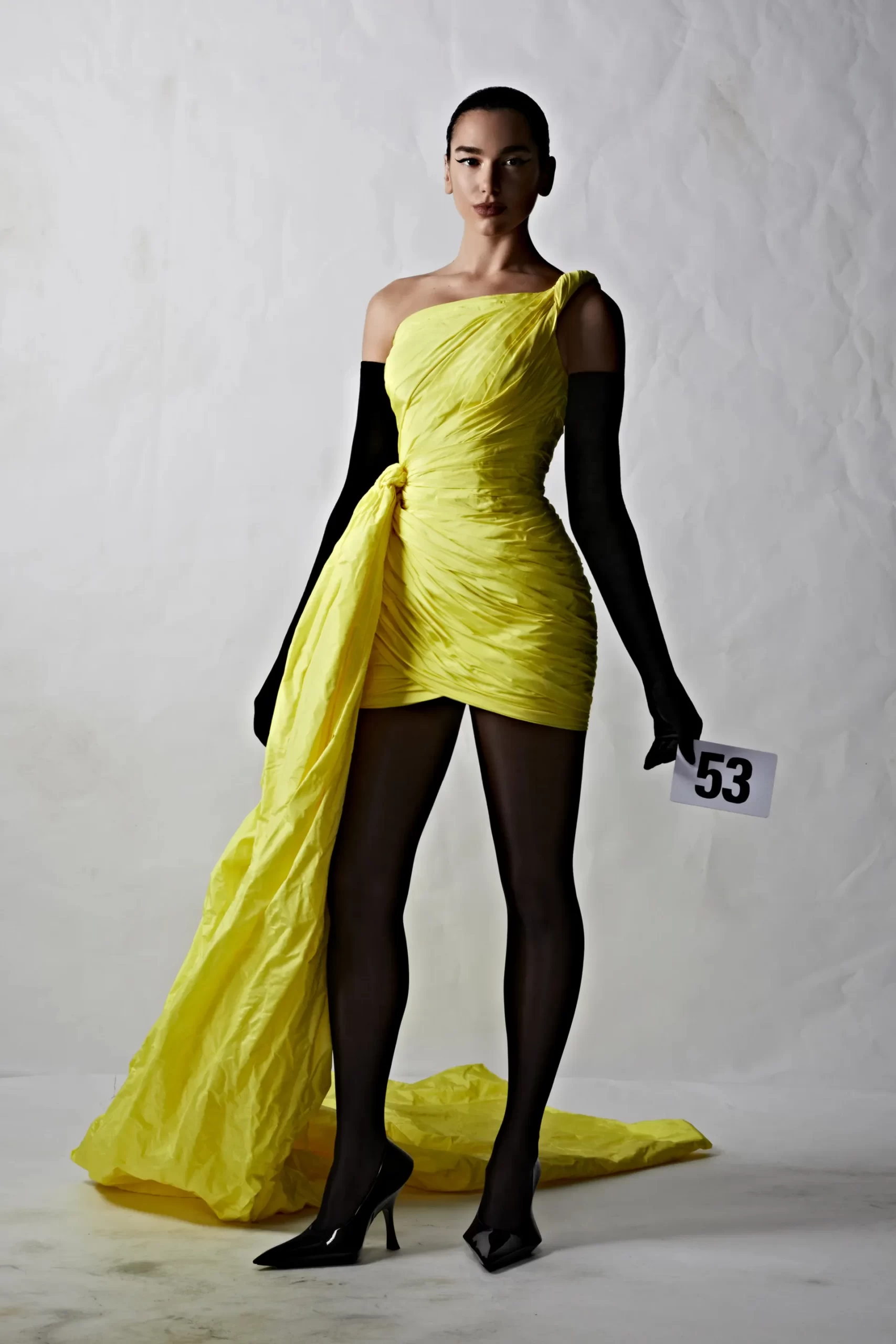 Dua Lipa bila je umotana u žutu tkaninu s crnim rukavicama do lakta i crnim tajicama, a reviju je naravno nosila i Balenciagina muza, Kim Kardashian, čiji se izgled nije mogao razlikovati od njezinih bezbrojnih prethodnih Balenciaga odjevnih kombinacija. Zašto se gnjaviti s izradom potpuno nove crne haljine za kada jednostavno možete zgrabiti jednu od desetaka koje ste već napravili, tu i tamo dodati nekoliko izmjena, a prikažete nešto što nije potpuno novo, ali je barem malo drugačije? U godini 2022 smo, recikliranje i ponovno nošenje iste odjeće je nikada važnije.