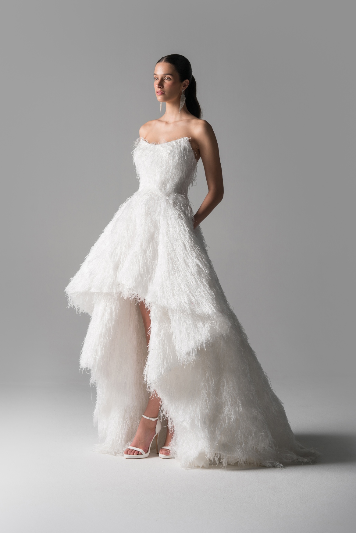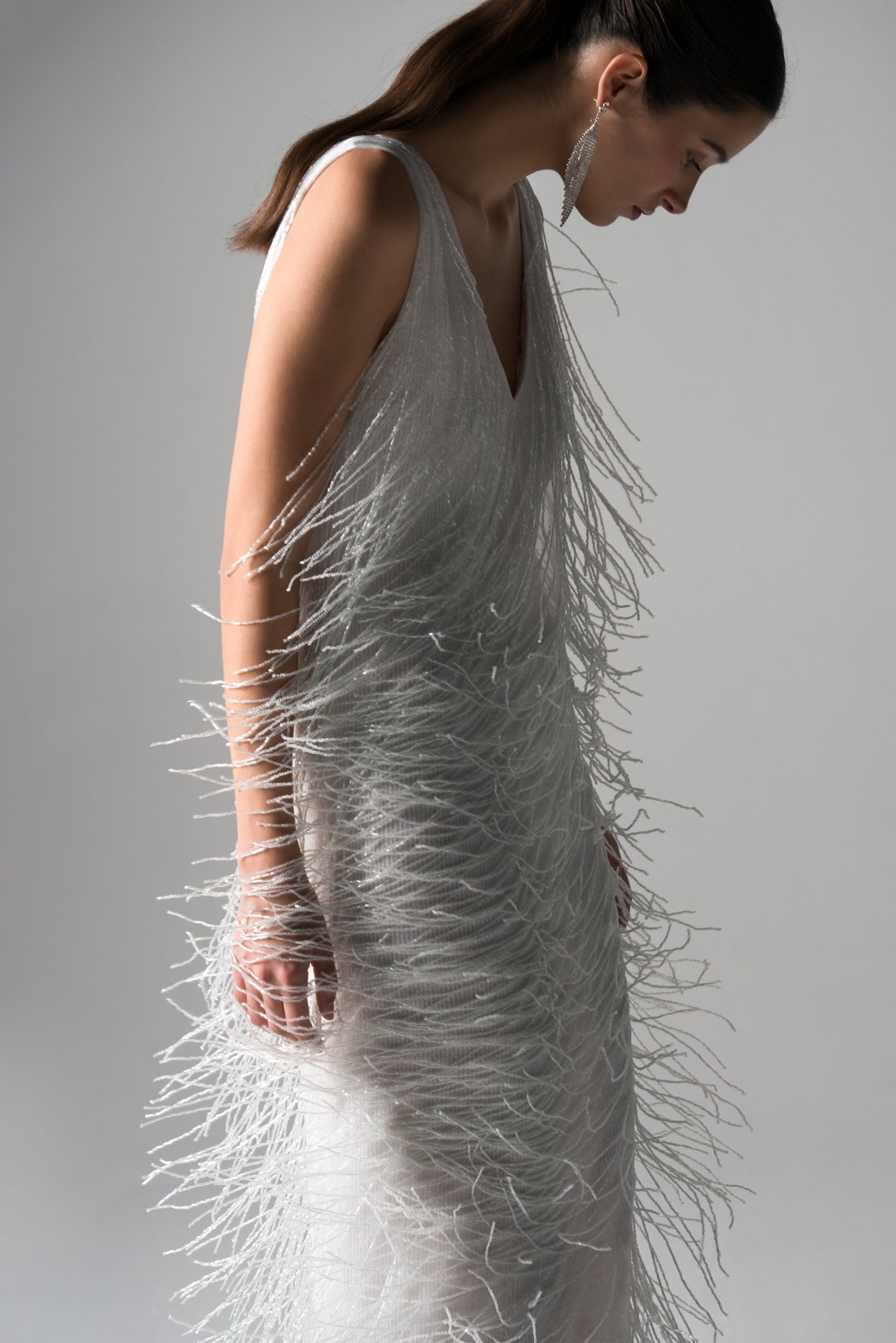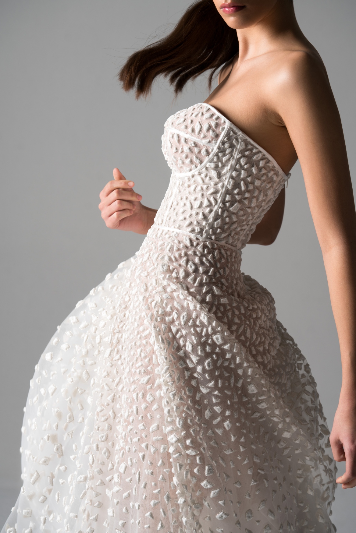 Atipične vjenčane modele, poput onoga sačinjenog od crop topa i raskošne suknje, haljine od eko perja ili modela ukrašenog razigranim resicama, upotpunjavaju modeli bogatih, voluminoznih vjenčanica s delikatnim detaljima, a razigranosti čitave bridal priče doprinosi, za eNVy room svojstveno, poigravanje asimetrijom i kontrastima. Prorezi unose dašak zavodljivosti i dramatičnosti, baš kao i ogoljena ramena ili otvorena leđa, “strogost” korzeta oponira romantičnoj lepršavosti, a posebna doza harmonije postignuta je igrom nabora i tekstura, kao i suprotstavljanjem punih i transparentnih materijala. Kolekciju čine modeli različitih dužina, pretežito u nijansama bijele, te u bogatoj paleti materijala koju čine svileni saten, crep organza, viskozni cadi, svileni cadi, čipke izvezene kristalima, resasti materijali od niski kristala, organza s reljefnim motivima, eko perje i plisse.