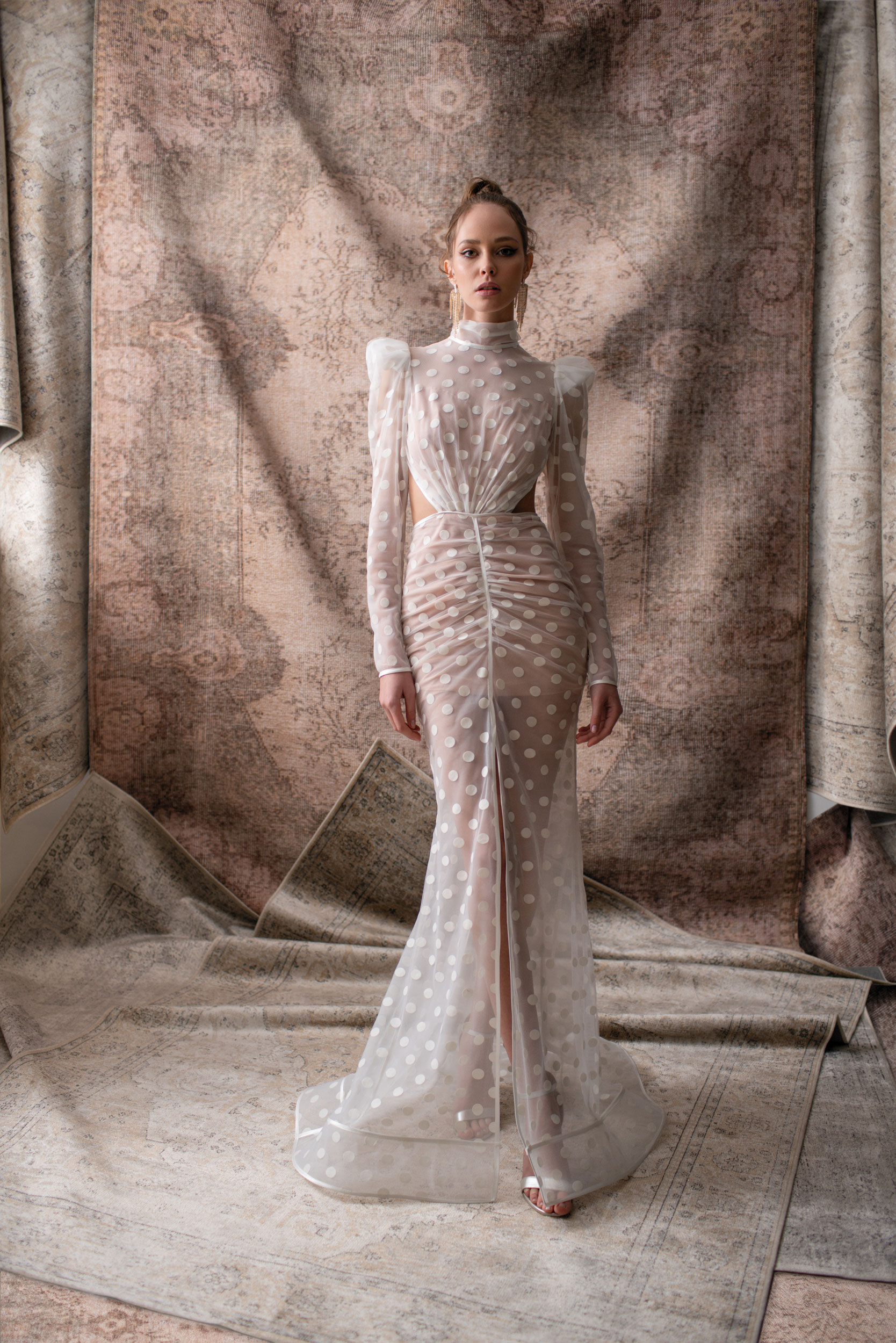 U fokusu nove kolekcije senzualno su otkrivena ramena što se posebno ističe na korzetiranim haljinama gdje svilena tkanina ili čipka nježno padaju preko ruku. Kolekcijom se provlače i modeli zavodljivih proreza, dubokih dekoltea ili graciozno ogoljenih leđa, uz dominantan lajt motiv koji čine glamurozni, voluminozni rukavi.