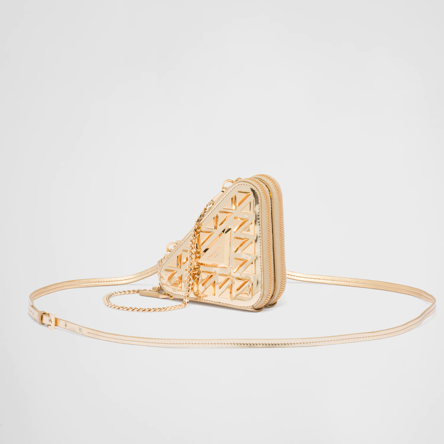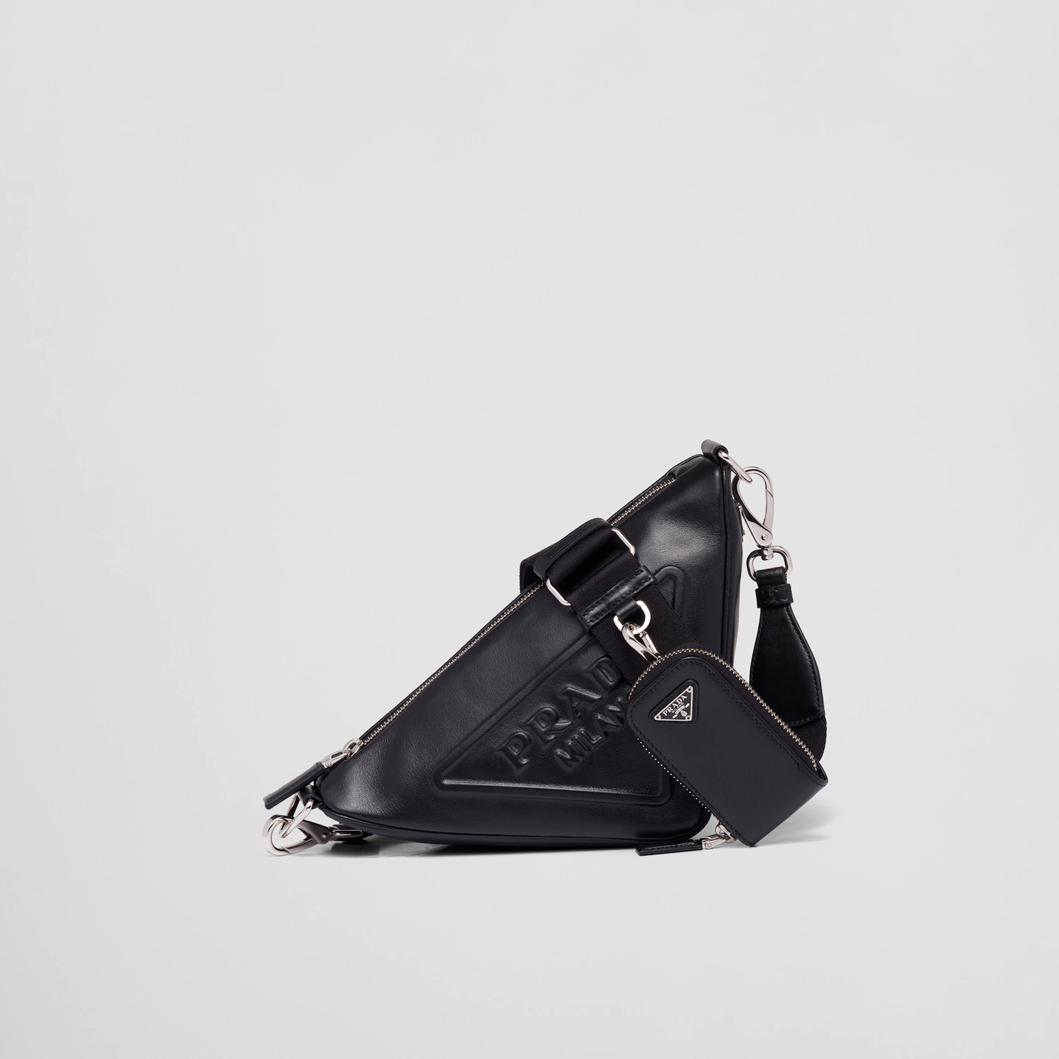 Silueta trokuta odražava se na geometrijskom uzorku — oba su inspirirana poznatim Pradinim logotipom od početka. Sama torba dolazi u brojnim bojama, materijalima i veličinama, uključujući torbu za rame, torbicu veličine narukvice, mini (za kovanice) i privjesak za ključeve. Stilovi se kreću od nekoliko stotina do nekoliko tisuća eura.